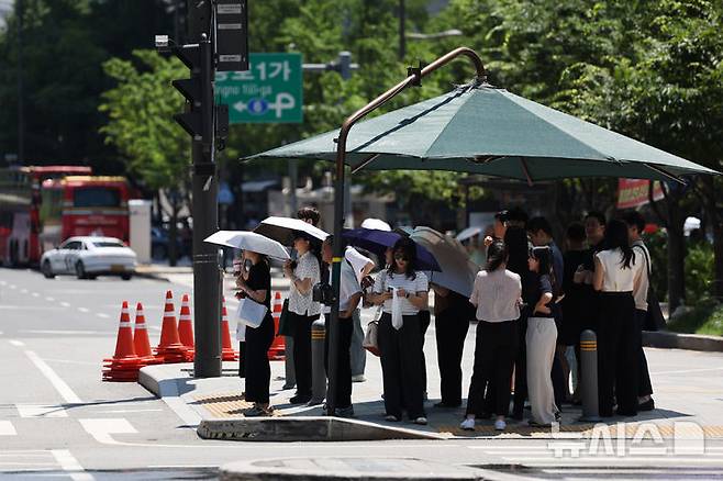 [서울=뉴시스] 조성우 기자 = 폭염이 계속되는 10일 서울 종로구 인근에서 시민들이 보행신호를 기다리며 그늘막아래에서 햇볕을 피하고 있다. 2025.07.10. xconfind@newsis.com