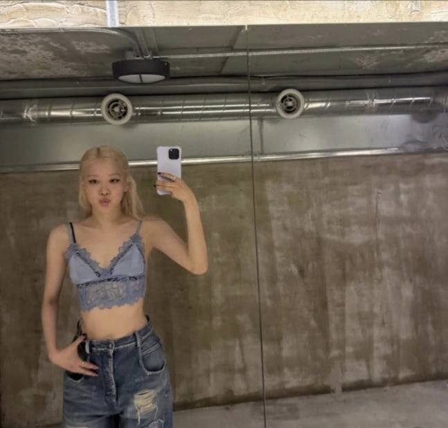 10일 로제는 자신의 SNS에 푸른색 이모티콘과 함께 다수의 사진을 게재했다. 공개된 사진 속 그는 레이스 디테일이 가미된 퍼플 브라톱에 와이드한 워싱 데님 팬츠를 매치해 눈길을 끌었다. 얇은 스트랩과 브이넥 라인 그리고 허리를 강조한 크롭 실루엣이 한여름 감성을 더했다.