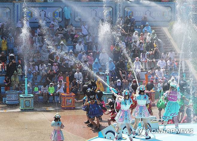 (용인=연합뉴스) 홍기원 기자 = 폭염이 이어지고 있는 10일 경기도 용인시 에버랜드를 찾은 시민들이 '슈팅 워터 펀 시즌2' 공연을 즐기고 있다. 2025.7.10