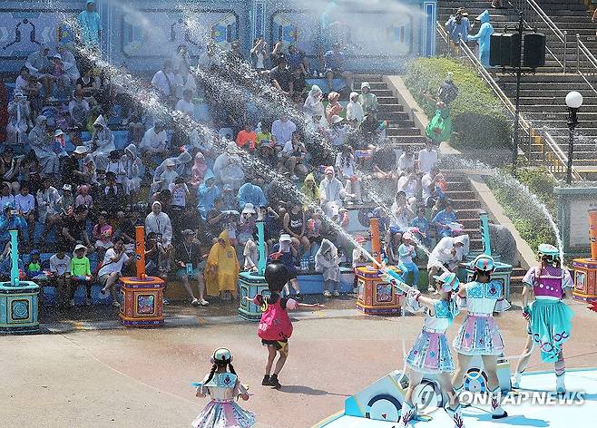 (용인=연합뉴스) 홍기원 기자 = 폭염이 이어지고 있는 10일 경기도 용인시 에버랜드를 찾은 시민들이 '슈팅 워터 펀 시즌2' 공연을 즐기고 있다. 2025.7.10