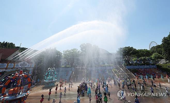 (용인=연합뉴스) 홍기원 기자 = 폭염이 이어지고 있는 10일 경기도 용인시 에버랜드를 찾은 시민들이 '슈팅 워터 펀 시즌2' 공연을 즐기고 있다. 2025.7.10