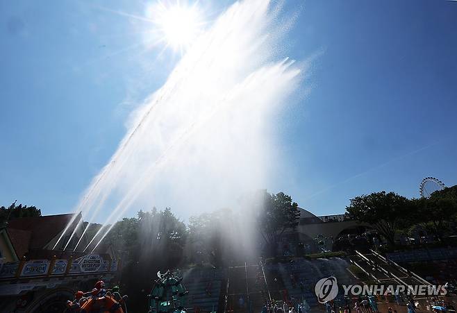 (용인=연합뉴스) 홍기원 기자 = 폭염이 이어지고 있는 10일 경기도 용인시 에버랜드를 찾은 시민들이 '슈팅 워터 펀 시즌2' 공연을 즐기고 있다. 2025.7.10