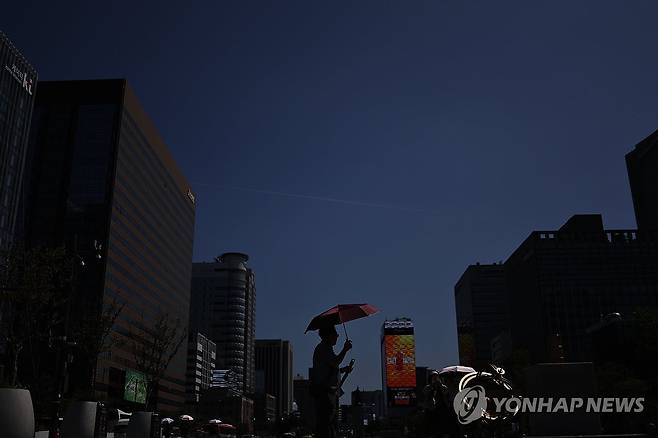 (서울=연합뉴스) 윤동진 기자 = 무더위가 이어지는 10일 서울 광화문광장에서 한 관광객이 양산을 쓴 채 이동하고 있다. 2025.7.10