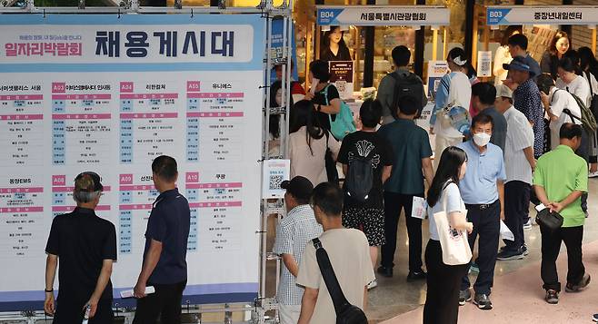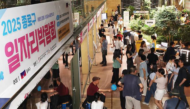 10일 서울 종로구 종각역 태양의 정원에서 열린 '2025 종로구 일자리박람회'를 찾은 구직자들이 일자리를 찾고 있다.
