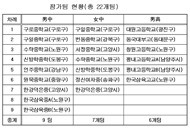 경기 규칙은 한국청소년스포츠동아리연맹 룰로 진행한다. 아래는 참가 팀 현황이다.