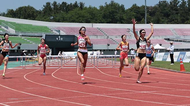 류나희는 오늘(10일) 익산 종합운동장에서 열린 대회 여자 100m 허들 결승에서 13초52의 개인 최고 기록을 세우며 가장 먼저 결승선을 통과했습니다.