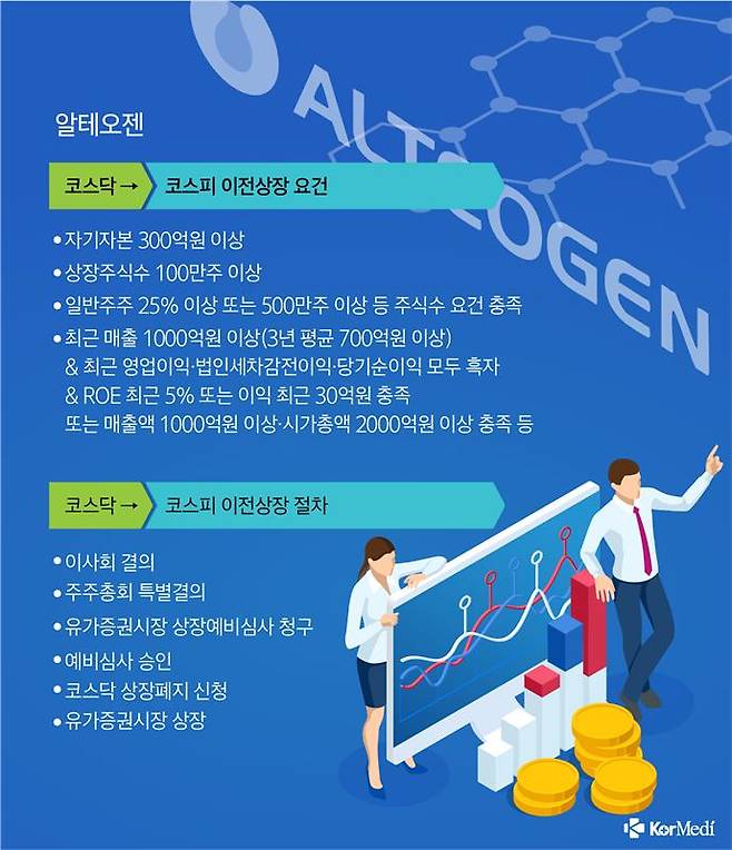 이전상장을 결정할 경우 알테오젠은 주주총회 특별결의를 거쳐 한국거래소에 코스피 상장예비심사를 청구해야 한다. 심사를 통과하면 코스닥 상장폐지를 신청하고, 코스피 상장 절차에 들어가게 된다.