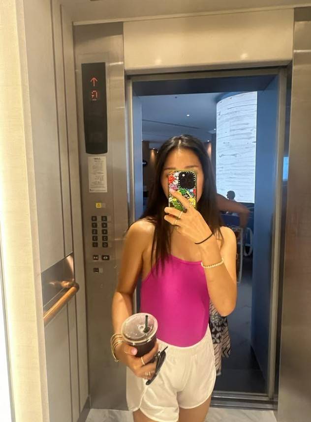 선글라스와 아이스 아메리카노를 든 손목에는 골드 팔찌를, 반대 손목에는 비즈 팔찌와 머리끈을 착용해 꾸민 듯 안 꾸민 듯한 현실적인 휴양지 룩을 완성했다.