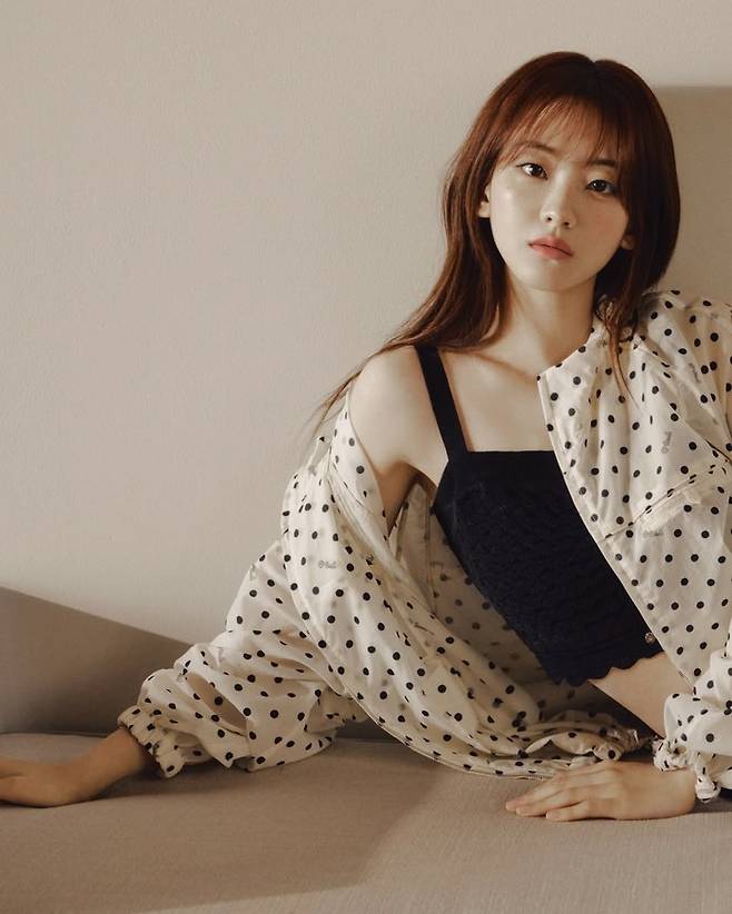 사진 속 조이현은 도트 셔츠를 흘러내리듯 걸친 채 블랙 니트 브라톱을 매치해 자연스러운 섹시미를 연출했다.