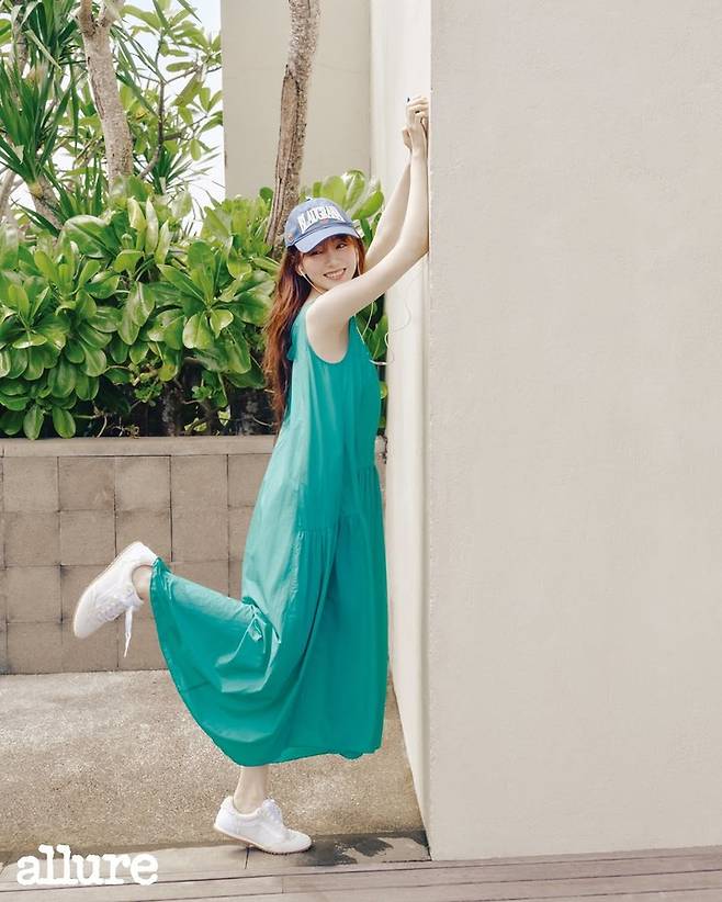 에메랄드 빛 슬리브리스 롱 원피스를 입고, 벽에 팔을 기대어 장난기 있는 표정을 짓고 있다. 파란 야구모자와 화이트 스니커즈가 산뜻한 매력을 더했으며, 발랄한 스타일링을 선보였다.