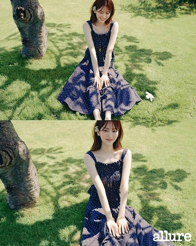 짙은 네이비 컬러의 도트 원피스를 입고 나무 그늘 아래 앉은 조이현은 머리 한쪽에 꽂은 하얀 꽃과 수줍게 미소짓는 모습으로 순수한 아름다움을 드러냈다.