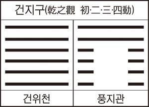 건괘 용구(用九)는 ‘견군용무수 길’(見群龍无首 吉)이다. 즉 ‘많은 무리를 이루고 있는 용들이 머리가 없는 것을 본다. 길하다’는 뜻이다.