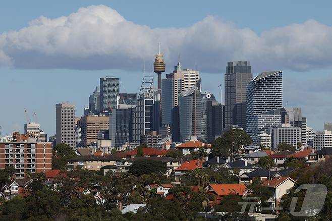 (시드니 로이터=뉴스1) 권영미 기자 = 2025년 7월 10일, 호주 시드니에서 시드니 중심업무지구(CBD) 스카이라인을 배경으로 보이는 주거용 부동산들.2025.07.10.