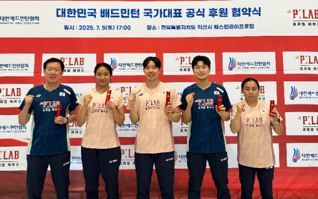 <사진> 한국 배드민턴 국가대표팀 박주봉 감독과 간판스타 안세영 등이 대표팀 후원사 르피랩과 후원 협약식에 참가했다. 대한배드민턴협회 제공
