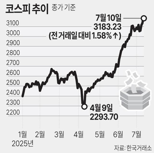 10일 한국거래소에 따르면 코스피는 전일보다 49.49포인트(1.58%) 오른 3183.23에 장을 마쳤다. 전날에 이어 또 한번 연고점을 경신했다. 앞서 장을 마친 뉴욕증시에서 엔비디아가 세계에서 처음으로 시가총액 4조달러를 넘어서는 등 강세를 보이자, 코스피에서도 삼성전자와 SK하이닉스 등 관련 주들의 강세가 두드러졌다.