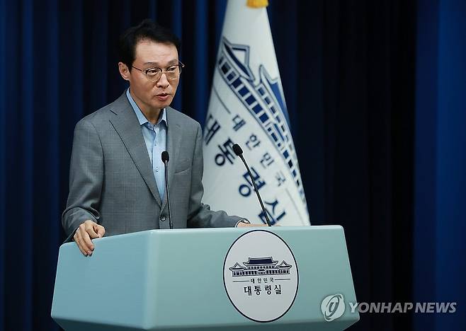 (서울=연합뉴스) 홍해인 기자 = 이규연 대통령실 홍보소통수석이 10일 서울 용산 대통령실 청사에서 이날 열린 수석·보좌관 회의 등 현안 브리핑을 하고 있다. 2025.7.10 [대통령실통신사진기자단]