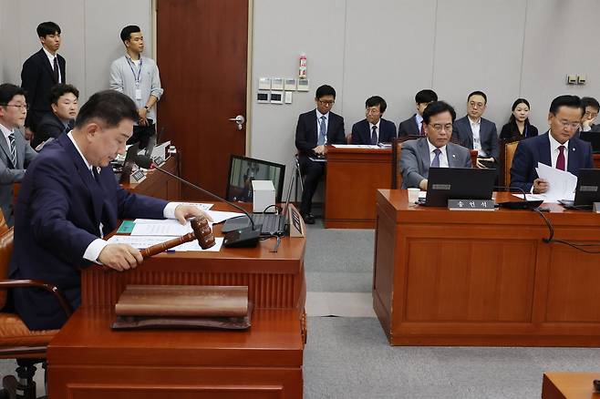 | ▲ 10일 국회 운영위원회 전체회의에서 더불어민주당 당대표 직무대행 겸 원내대표인 김병기 위원장이 안건을 상정하며 의사봉을 두드리고 있다. |