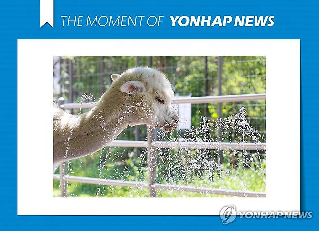 (서울=연합뉴스) 신현우 기자 = 전국 대부분 지역에 폭염 특보가 발효된 10일 서울 광진구 어린이대공원 동물원에서 알파카가 물로 더위를 식히고 있다. 2025.7.10 [THE MOMENT OF YONHAPNEWS]