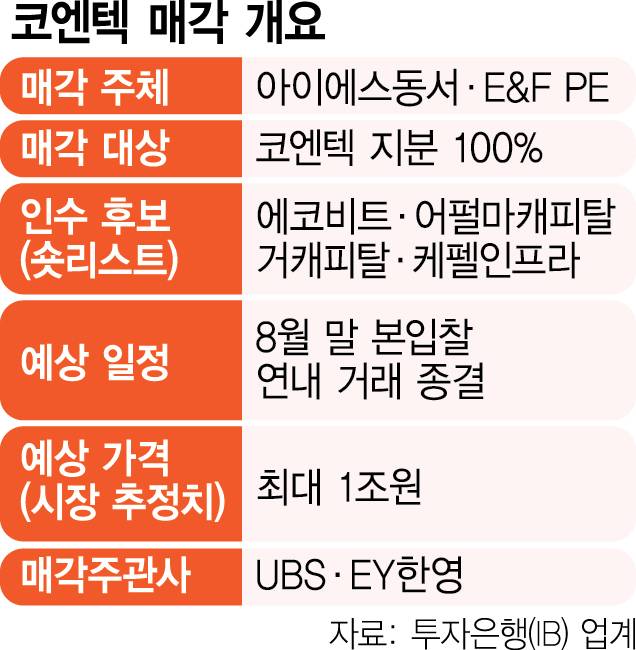 10일 투자은행(IB) 업계에 따르면 에코비트는 코엔텍 매각을 추진 중인 아이에스동서, E&F PE 측에 인수 의향을 타진했다. 어펄마캐피탈·거캐피탈·케펠인프라 등 국내외 사모펀드(PEF) 운용사들과 함께 사실상 적격예비후보(쇼트리스트)에 포함된 것으로 알려졌다. 매각 측은 인수 의향을 드러낸 곳들에 실사 기회를 부여하고 다음 달 말 본입찰을 실시할 방침이다. 이후 우선협상 대상자를 선정하는 등 연내 모든 거래를 마친다는 계획이다. 매각 주관사는 UBS와 EY한영이 맡고 있다.