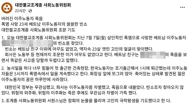 | ▲ 조계종 사노위는 9일 오후 6시께 sns에 글을 올리고 "빈소에는 (고인의) 베트남 친구 이외에 아무도 없었고, 액자 속 23살 앳된 고인의 얼굴이 맞이했다. 회사든 노동부 등 현재까지 조문한 이가 아무도 없었다고 한다"라고 전했다. 빈소를 지킨 고인의 친구도 "친구의 죽음을 보면서 똑같은 사고를 당할까 두렵다"고 말했다고 한다. |