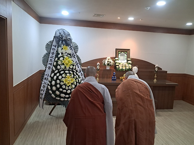 | ▲ 대한불교조계종 사회노동위원회에 따르면 고인의 빈소가 마련된 구미 강동병원 장례식장은 찾아오는 이 없이 황량했다. 이날 빈소를 찾은 서원 스님은 참회의 눈물을 흘리며 고인의 극락왕생을 기도하며 고인의 넋을 가렸다. |