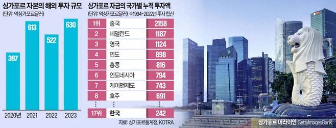 하지만 싱가포르 자본의 한국 투자는 아직 미미하다. 싱가포르 통계청 집계에 따르면 1994~2022년 누적 투자액 기준 싱가포르의 최대 투자국은 중국으로 2158억싱가포르달러(약 231조6700억원)에 달했다. 네덜란드와 영국이 뒤를 이었으며 홍콩과 인도네시아, 말레이시아도 주요 투자처로 꼽혔다. 반면 한국에 대한 누적 투자액은 242억싱가포르달러로 중국의 11% 수준에 머물렀다. 다만 2018년까지 누적 투자액이 94억싱가포르달러에 불과한 점을 감안하면 증가 속도가 빠르다.