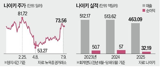 세계 최대 스포츠 브랜드 나이키가 지난달 26일 2025회계연도 4분기(3~5월) 실적을 발표하자 미국 투자 전문 매체들은 '회복' '컴백' 같은 단어를 쏟아냈다.