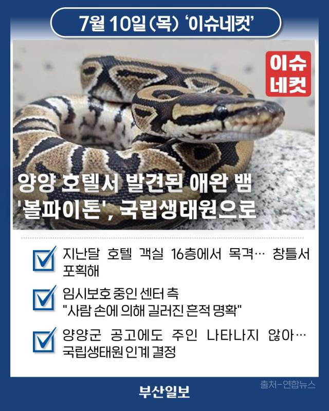 양양 호텔서 발견된 애완 뱀 '볼파이톤', 국립생태원으로
