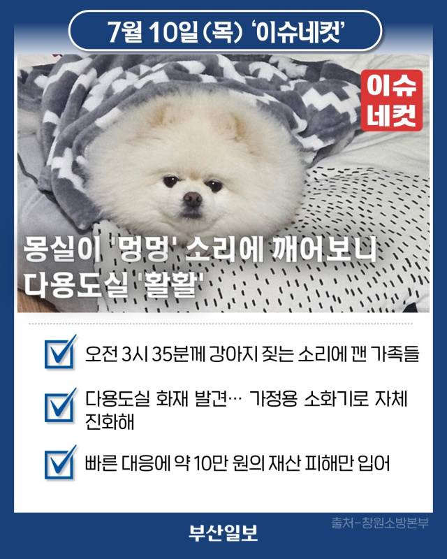 경남 창원시 진해구의 한 아파트 다용도실에서 불이 난 가운데, 반려견 '몽실이(포메라니안)'의 기지로 빠르게 진압됐습니다. 10일 창원소방본부에 따르면 전날 오전 3시 35분께 창원시 진해구 한 아파트 9층 집 다용도실에서 불이 났습니다. 당시 가족들은 깊은 잠에 빠져 있었는데, 반려견 '몽실이'가 계속해서 짖으면서 잠이 깼습니다. 잠자리에서 일어난 거주자는 다용도실 김치냉장고 쪽에서 불이 난 것을 목격하고 곧바로 가정용 소화기로 진화했습니다. 소방당국은 김치냉장고, 수납장 일부가 불에 타 약 10만 원의 재산 피해가 난 것으로 파악했습니다. 창원소방본부 관계자는 "반려견이 화재 발생을 조기에 감지해 위험을 알리고, 거주자가 신속하게 소화기를 사용한 덕분에 큰 피해를 막을 수 있었다"며 "화재 초기 대응의 중요성과 주택용 소방시설 필요성을 잘 보여주는 사례"라고 설명했습니다.