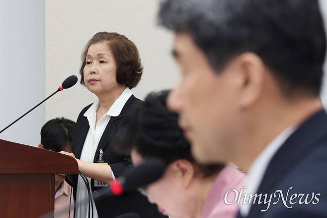 | ▲ 손효숙 리박스쿨 대표가 10일 서울 여의도 국회 교육위원회에서 열린 리박스쿨 청문회에 증인으로 출석해 의원 질의에 답변하고 있다. 오른쪽은 이주호 사회부총리 겸 교육부 장관. |