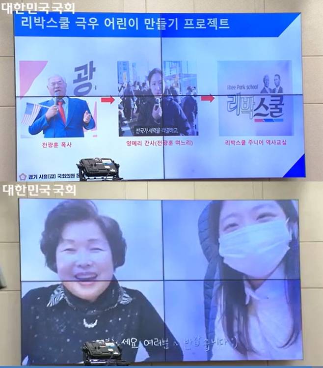 | ▲ 문정복 더불어민주당 의원실이 10일 리박스쿨 청문회에서 자료로 공개한 '리박스쿨 극우 어린이 만들기 프로젝트' 관련 PPT자료 화면. 문 의원은 손 대표(아래 왼쪽)와 전광훈 목사 연관성을 추궁했다. |