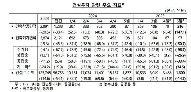 이런 가운데 건설투자 관련 건축착공면적(21만6,000㎡)은 1년 전보다 147.1%나 증가한 반면, 건축허가면적(9만7,000㎡)은 50.7% 감소했으며, 건설수주액(1,600억원)은 14.7% 줄었다.