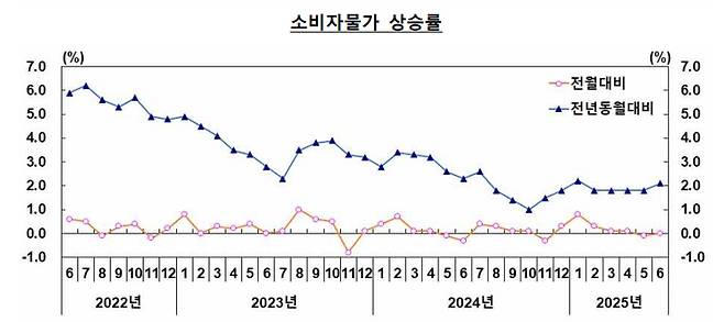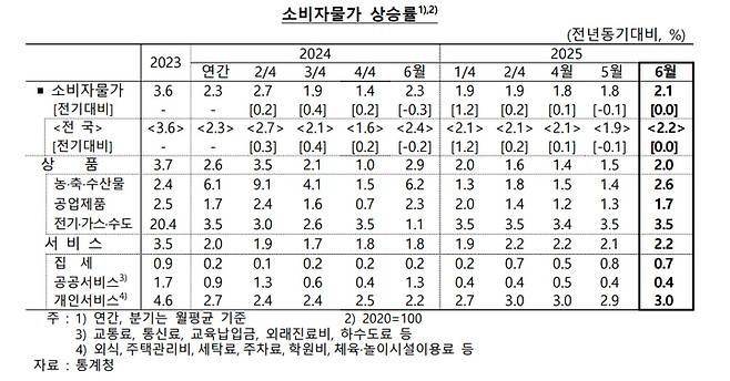 6월중 소비자물가지수는 전년동월대비 2.1% 상승했다.