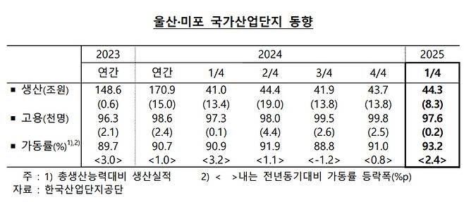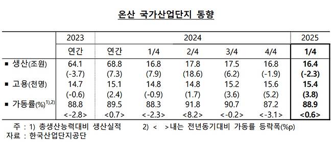 온산국가산단의 올해 1/4분기중 생산액은 16조4,000억원으로 2.3% 감소했고, 고용인원은 약 1.5만명으로 전년동기대비 3.8% 증가했다.