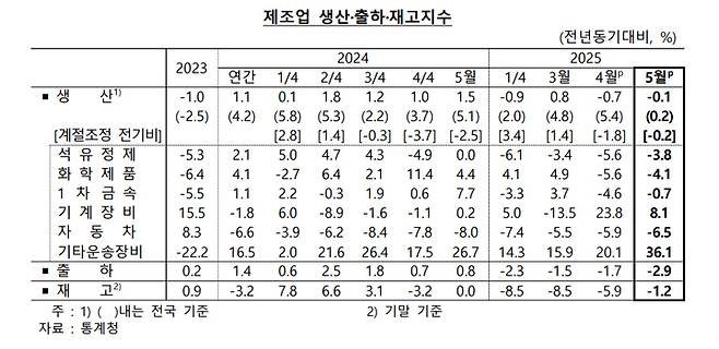 이 동향 자료에 따르면 지역 제조업 생산은 자동차(-6.5%), 화학제품(-4.1%), 석유정제(-3.8%) 등 전년동월대비 평균 0.1% 감소(전월대비 -0.2%)했다.