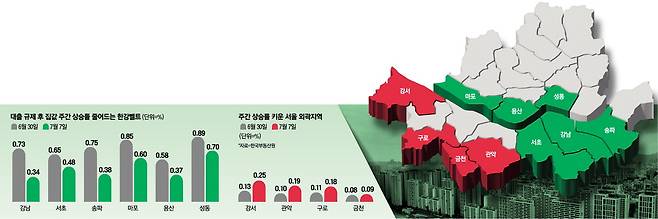 6·27 대출 규제 여파가 작은 서울 외곽지역의 풍선효과에 대한 우려도 여전하다. 한국부동산원에 따르면 이번주 강서구 아파트값 상승률은 0.25%로 전주(0.13%) 대비 뛰었다. 관악구(0.10%→0.19%), 구로구(0.11%→0.18%), 금천구(0.08%→0.09%)도 상승폭이 확대된 건 매한가지였다. 다만 노원구(0.17%→0.13%), 도봉구(0.08%→0.05%) 등 강북권역 집값 상승폭은 축소됐다.
