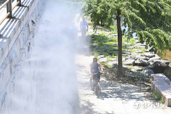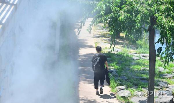 폭염이 지속된 10일 오후 수원특례시 팔달구 지동교에서 행인들의 더위를 식혀주기 위한 쿨링포그가 분사되고 있다.