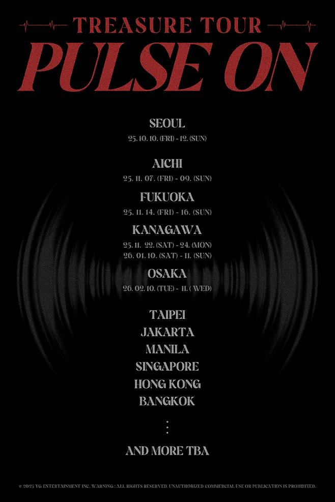 YG엔터테인먼트는 10일 트레저의 새 투어 ‘TREASURE TOUR [PULSE ON]’의 상세 일정을 공개했다. 공개된 포스터에 따르면 트레저는 오는 10월 10일부터 12일까지 서울에서 3회 공연을 시작으로, 아시아 11개 주요 도시에서 글로벌 팬들과 만날 예정이다.