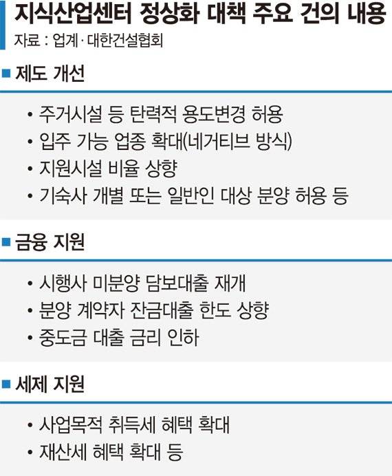건협은 지산 리스크가 확산되는 것을 막기 위해서는 주거 용도 전환 지원, 실수요자 보호 등 정상화 방안 마련이 시급하다는 설명이다. 주거용도 전환 촉진을 위한 다양한 지원과 중단된 시행사 대상 미분양 담보 대출 재개가 필요하다고 강조했다. 또 실수요자 등을 대상으로 잔금 대출 한도 복원 등도 건의했다. 사업목적 분양 시 취득세 혜택 확대와 취득세 중과 배제, 재산세 혜택 확대 등의 세제 지원도 촉구했다. B시행사 관계자는 "지산 계약자를 보면 상당수가 소상공인 등 실수요자"라며 "시공사로 리스크가 전이되면서 건설사 신용보강 등이 차질을 빚고, 결국 공급 위축으로 연결될 수 있는 상황이다"고 우려했다.