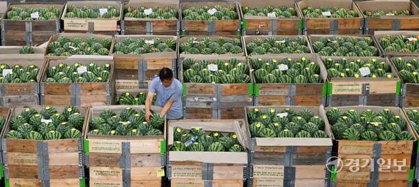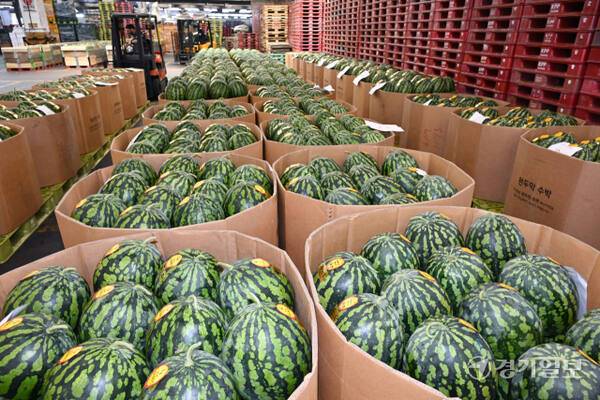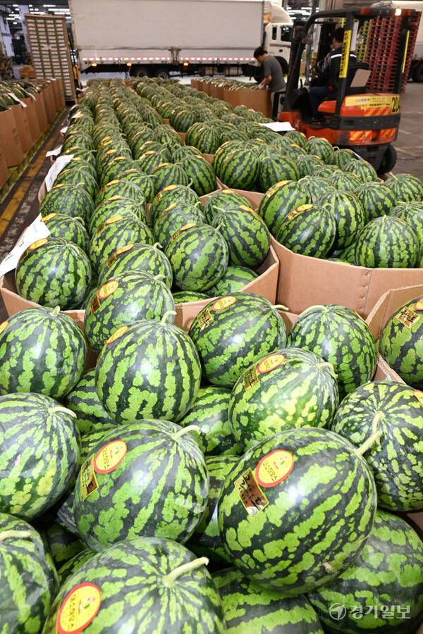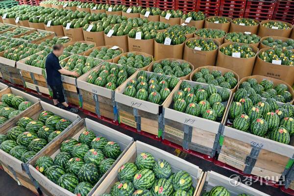 계속되는 폭염 여파로 제철 과일, 채소 값이 급등하면서 식탁 물가에 경고등이 켜지고 있다. 특히 수박의 경우 부진한 작황 속에 수요는 늘어나 가격이 평년 대비 30% 가량 올랐다. 10일 구리농수산물도매시장 청과동에서 관계자가 경매를 앞둔 수박 상태를 점검하고 있다.