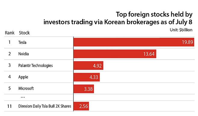Korean investors held $19.89 billion worth of Tesla shares — the most among all foreign equities — as of Tuesday, roughly accounting for 2 percent of the EV carmaker's market value.