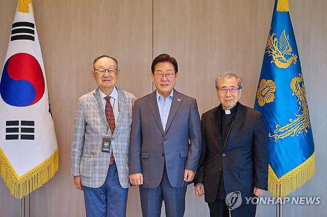 (서울=연합뉴스) 이재명 대통령이 10일 서울 용산 대통령실 청사에서 오찬 간담회에 참석한 시민사회 원로 백낙청 교수(왼쪽), 함세웅 신부와 기념촬영을 하고 있다. 2025.7.10 [대통령실 제공. 재판매 및 DB 금지]