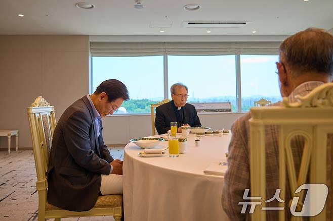 (서울=뉴스1) 허경 기자 = 이재명 대통령이 10일 서울 용산 대통령실에서 시민사회 원로인 함세웅 신부, 백낙청 서울대 명예교수와 오찬 간담회를 하기 앞서 기도하고 있다. (대통령실 제공. 재판매 및 DB 금지) 2025.7.10/뉴스1