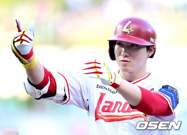 2회말 2사 2루 상황 SSG 박성한이 달아나는 1타점 적시타를 날리고 1루에 안착해 기뻐하고 있다. 2025.07.10 / dreamer@osen.co.kr