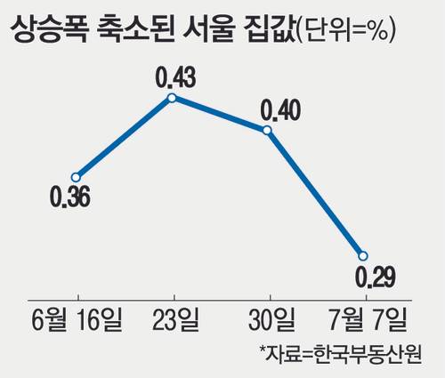 10일 한국부동산원이 발표한 7월 첫째주(7일 기준) 주간 아파트 가격 동향에 따르면 이번주 서울 아파트값은 전주 대비 0.29% 오르며 23주 연속 상승했다. 하지만 상승폭은 0.43%→0.40%→0.29%로 2주 연속 줄었다. 정부가 수도권 주택담보대출(주담대) 한도를 6억원으로 묶는 초강경 6·27 대책을 내놓은 데 따른 영향으로 풀이된다.