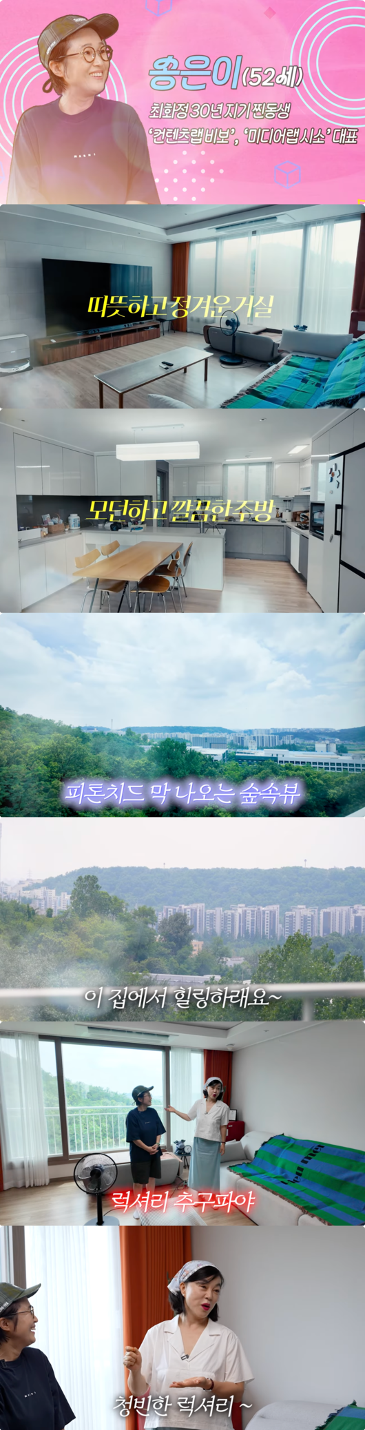 10일 오후 유튜브 채널 ‘안녕하세요 최화정이에요’에는 ‘재테크여왕 송은이가 50살에 독립한 자연속 아파트 최초공개 (+김숙,집들이선물)’라는 이름의 영상이 공개됐다.