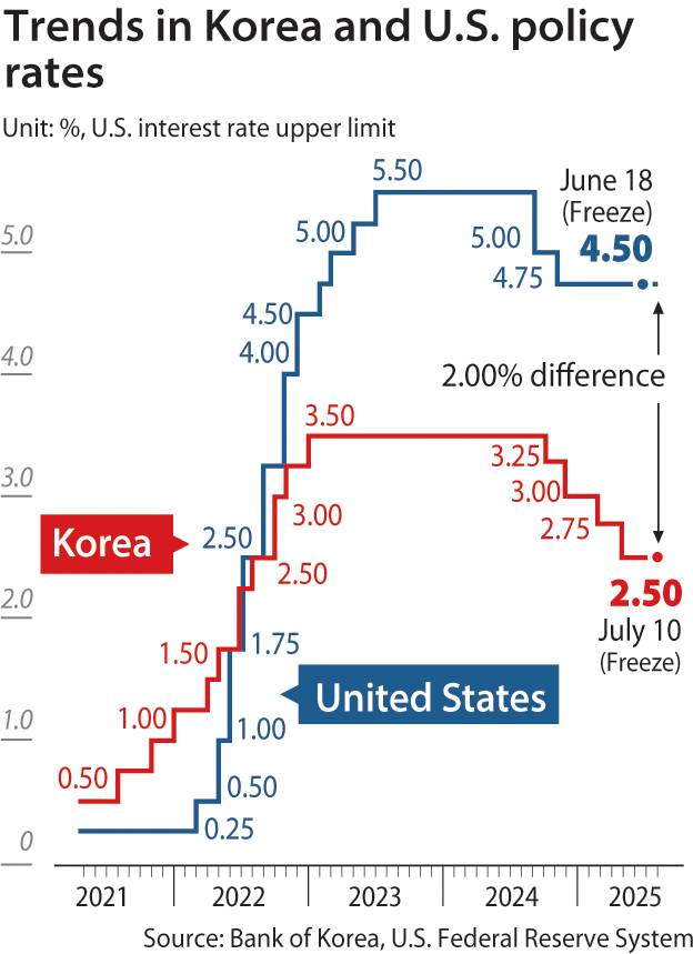 At its monetary policy meeting on Thursday, the BOK’s monetary policy board unanimously voted to keep the base interest rate steady at 2.5 percent. This marks a temporary hold as the board evaluates the impact of recent lending curbs introduced on June 27 to cool the overheated housing market before determining the timing and scale of future cuts.