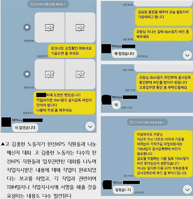 김씨는 2024년 10월 "지나든 길이든 다른 KPS 직원분 중에 공사감독란에 사인 좀 부탁드린다"라고, 2025년 4월엔 "작업하려면 TBM일지 공사감독 사인이 있어야 한다. 나중에 작성 좀 해주세요"라고 메시지를 보내기도 했다. 이를 두고 대책위는 (재하청업체의 작업을 관리·감독해야 하는)한전KPS가 일상적으로 관리·감독을 형식적으로 하면서 안전관리에 소홀해 왔다는 사실을 알 수 있는 대목"이라고 주장했다.