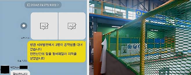 대책위가 공개한 사진을 보면, 김씨는 지난 2024년 2월 27일 한전KPS 관계자에게 "방금 서부발전에서 3명이 공작실을 다녀갔다. 안전난간 망을 정비해달라는 지적을 받았다"라고 보냈다. 그러자 관계자는 "감사합니다"라고 답했다.
