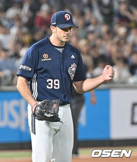 두산 베어스 잭로그가 6회말 무사 1루 롯데 자이언츠 한태양을 2루수 병살로 잡고 주먹을 불끈 쥐고 있다. 2025.07.10 / foto0307@osen.co.kr